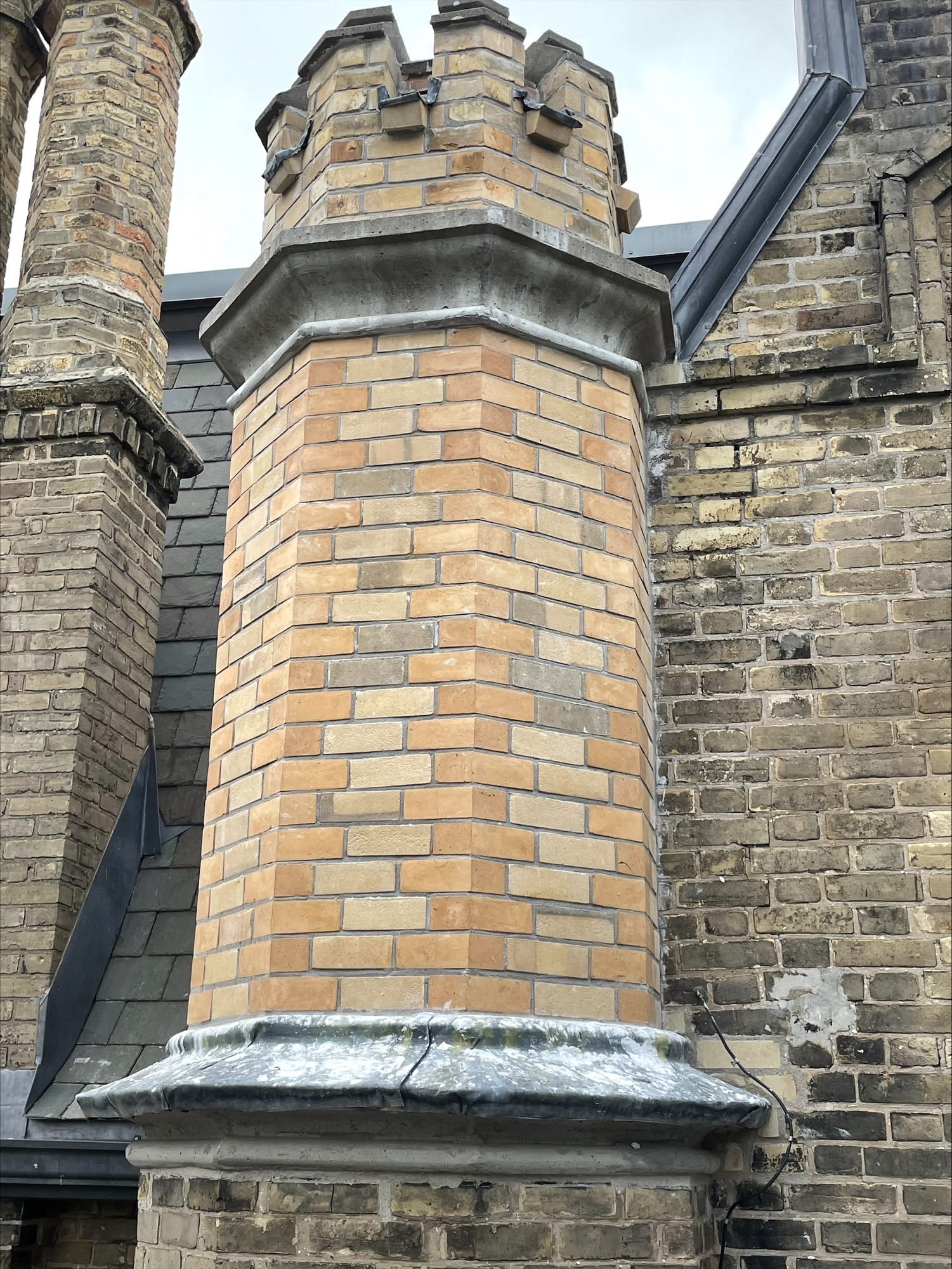 We recently undertook the exciting project of rebuilding the exterior turrets of a building in Whitby, Ontario. The turrets had started to show signs of deterioration, with crumbling bricks and unstable structures that needed urgent attention. Our team carefully removed the damaged brick, ensuring the surrounding area remained intact. To maintain the historic charm of the school, we matched the new mortar with heritage lime mortar, which not only blended seamlessly with the existing structure but also allowed for the natural movement of the bricks. This approach is essential in preserving the building’s integrity over time. Once the repairs were complete, the turrets stood tall and strong, enhancing the school's unique architectural features. The project was a rewarding experience, and we’re proud to have contributed to preserving an important piece of local history while providing a safe environment for students.