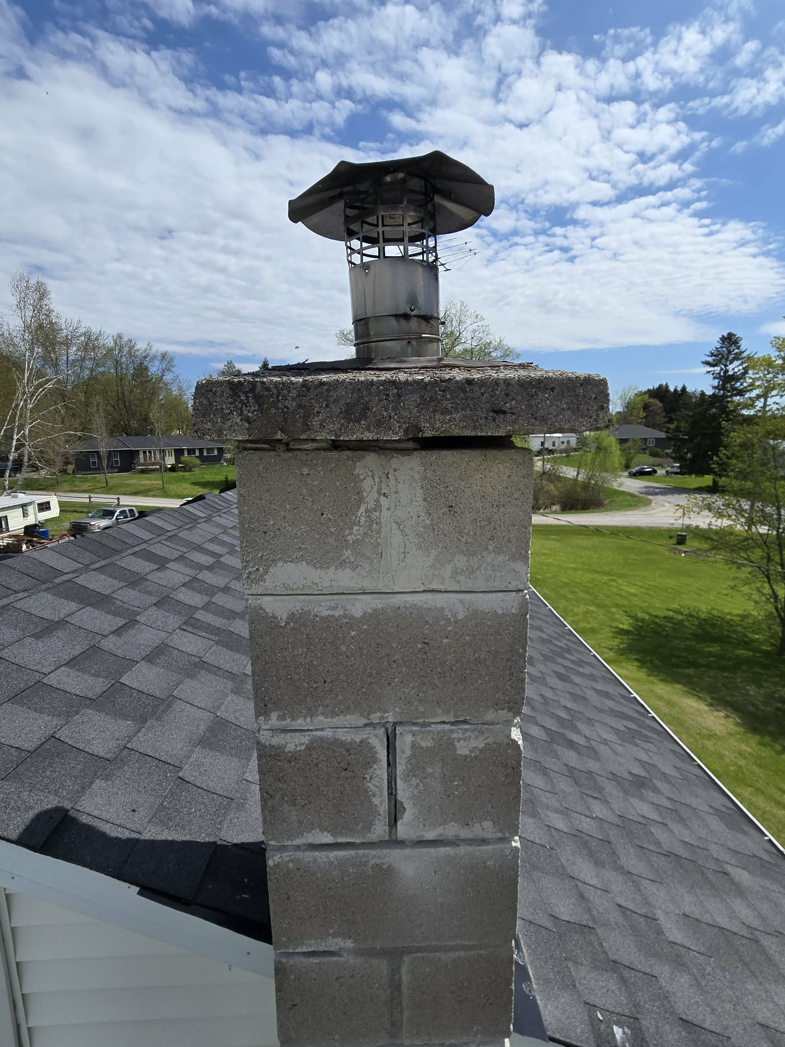 The homeowner ended up saving a significant amount of money by not needing a rebuild, and the chimney is properly repaired and built to last through Ontario weather cycles.